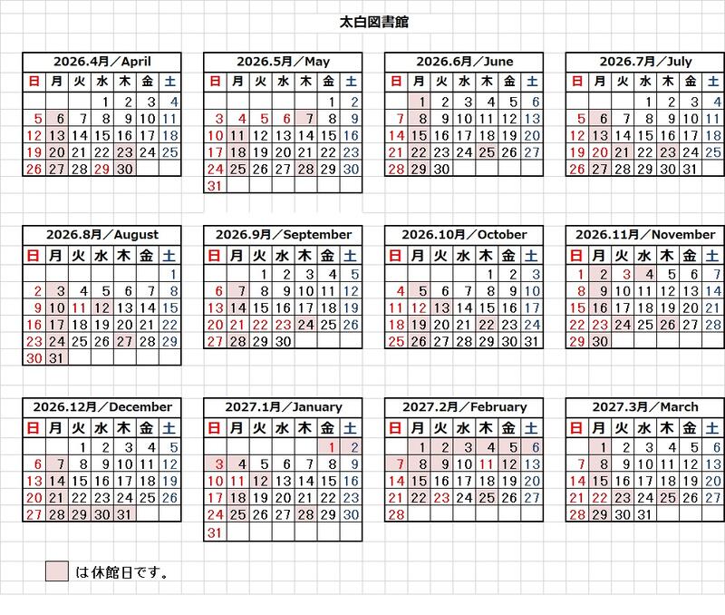 2026年 4月今月へ 日 月 火 水 木 金 土 29(日) 30(月) 定例休館31(火) 1(水) 2(木) 3(金) 4(土) 5(日) 6(月) 定例休館7(火) 8(水) 9(木) 10(金) 11(土) 12(日) 13(月) 定例休館14(火) 15(水) 16(木) 17(金) 18(土) 19(日) 20(月) 定例休館21(火) 22(水) 23(木) 定例休館24(金) 25(土) 26(日) 27(月) 定例休館28(火) 29(水)昭和の日30(木) 定例休館1(金) 2(土) 2026年 4月今月へ